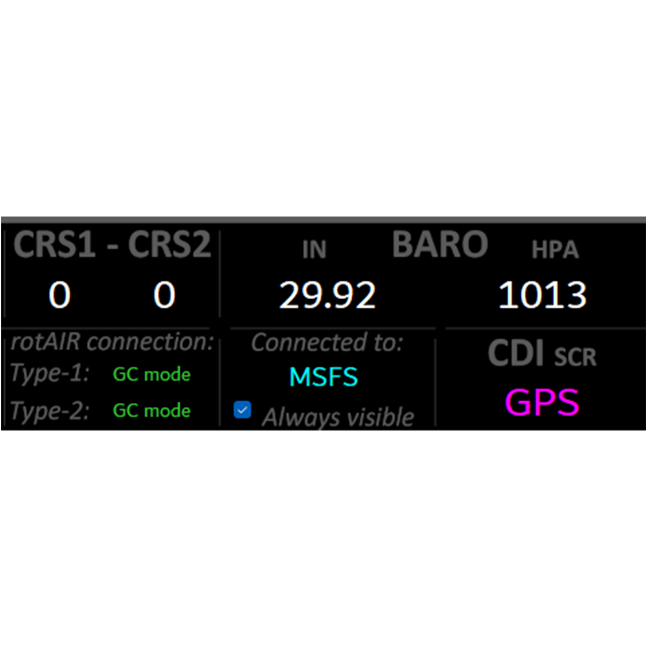 It ensures instant synchronization and real-time response between your rotAIR encoders and the simulator, displaying and controlling flight parameters such as NAV, COM, ADF, ALT, BARO, XPDR, and more.