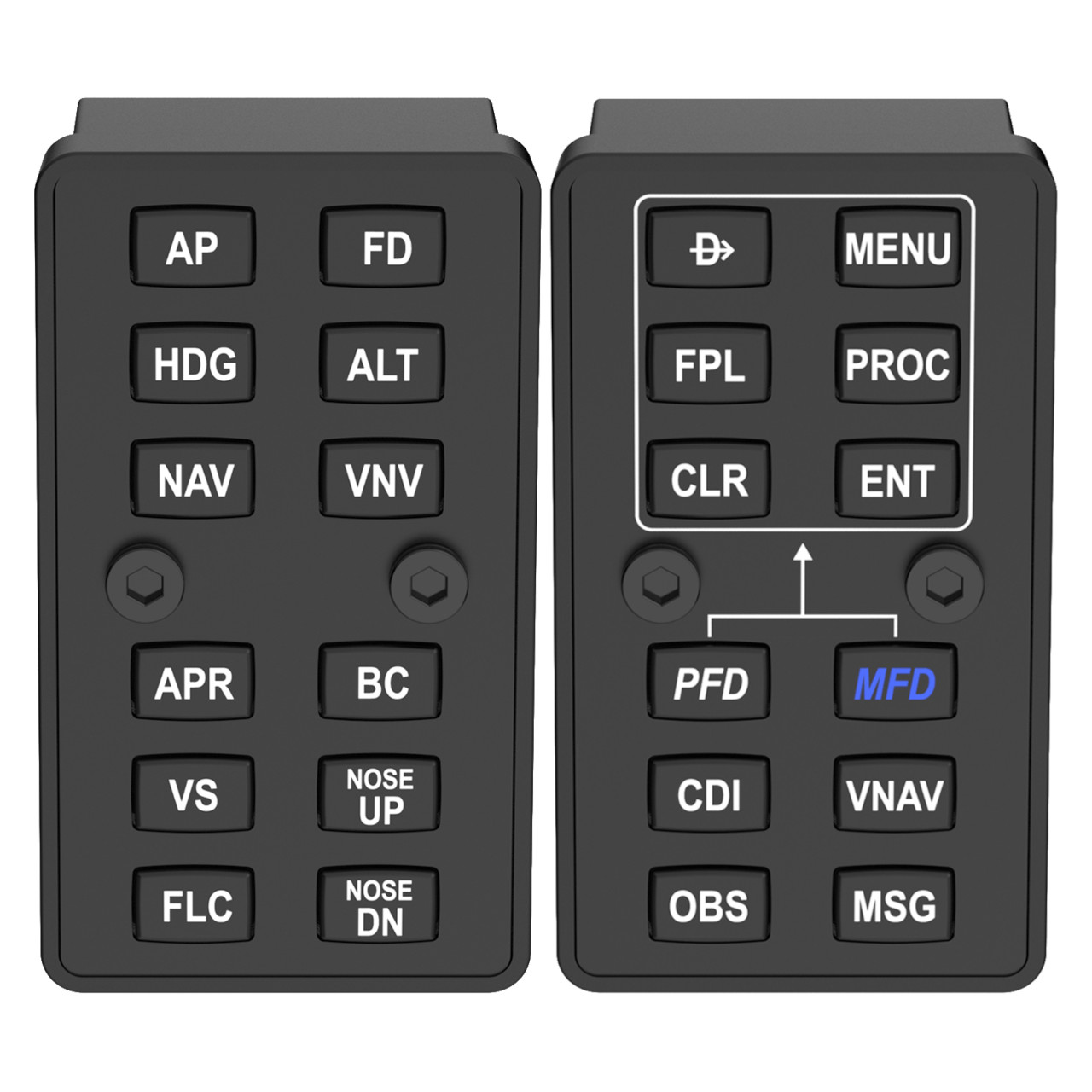 Push-button modules for GA flight simulation, the natural companion to rotAIR. Includes 2 modules with 24 backlit push buttons inspired by G1000 hardware, compatible with G1000, GNS 530, and analog cockpits, with backlighting.